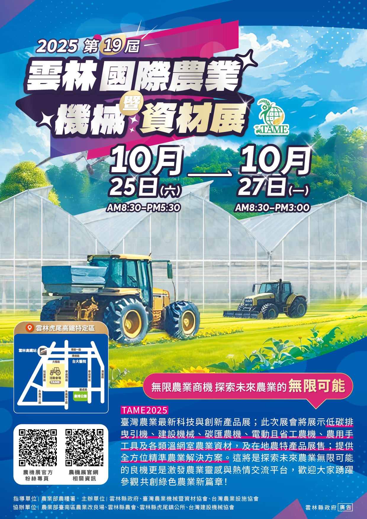 轉知雲林縣政府辦理「2025第19屆雲林國際農業機械暨資材展」活動。