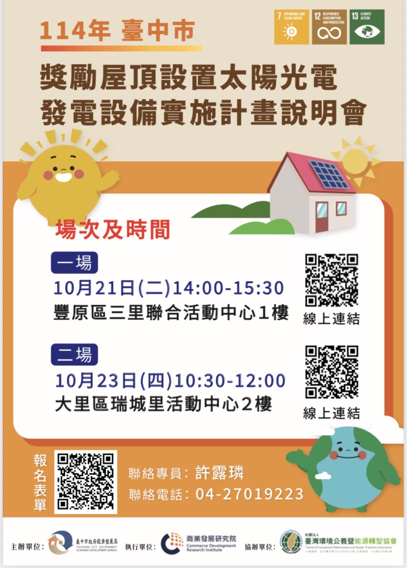 二、為加速「臺中市政府經濟發展局114年獎勵屋頂設置太陽光電發電設備實施計畫」申請作業,辦理推廣說明會,協助系統業者及民眾快速了解申請流程,同時鼓勵民眾設置太陽光電發電設備,並持續關注綠能發展,共同邁向綠色永續的未來。