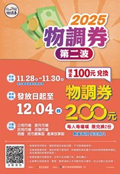 1、民眾以現金100元,可兌換1份面額200元的物調券。