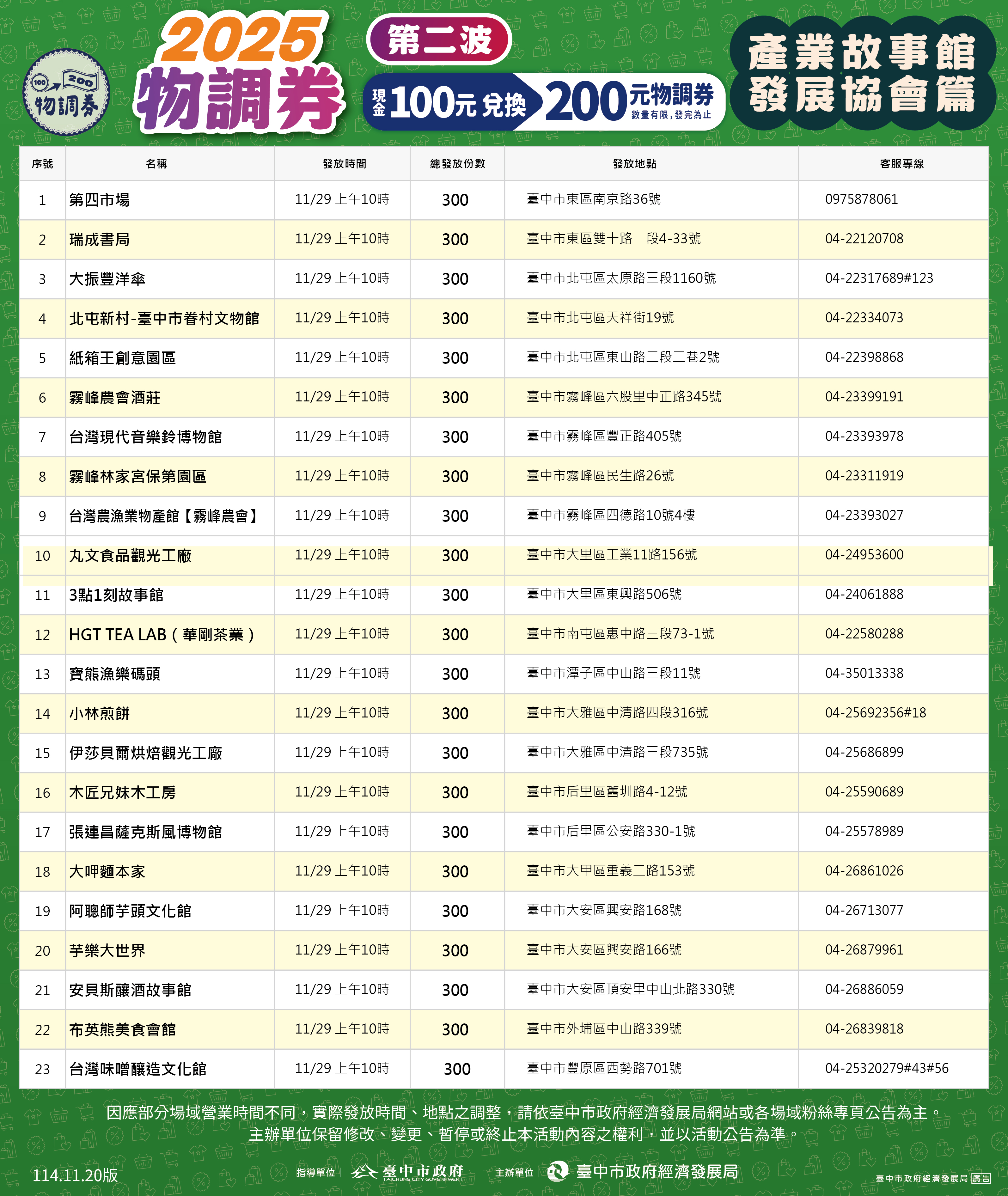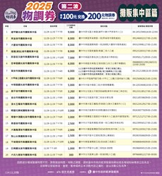 三、發放地點:29處公有市場、5處民有市場、2處公有委外市場、5處民營市場、20處攤販集中區、23處商圈,以及「霧峰原流新創聚落」與「臺中市產業故事館發展協會」23個所屬會員店家,共108處場域。