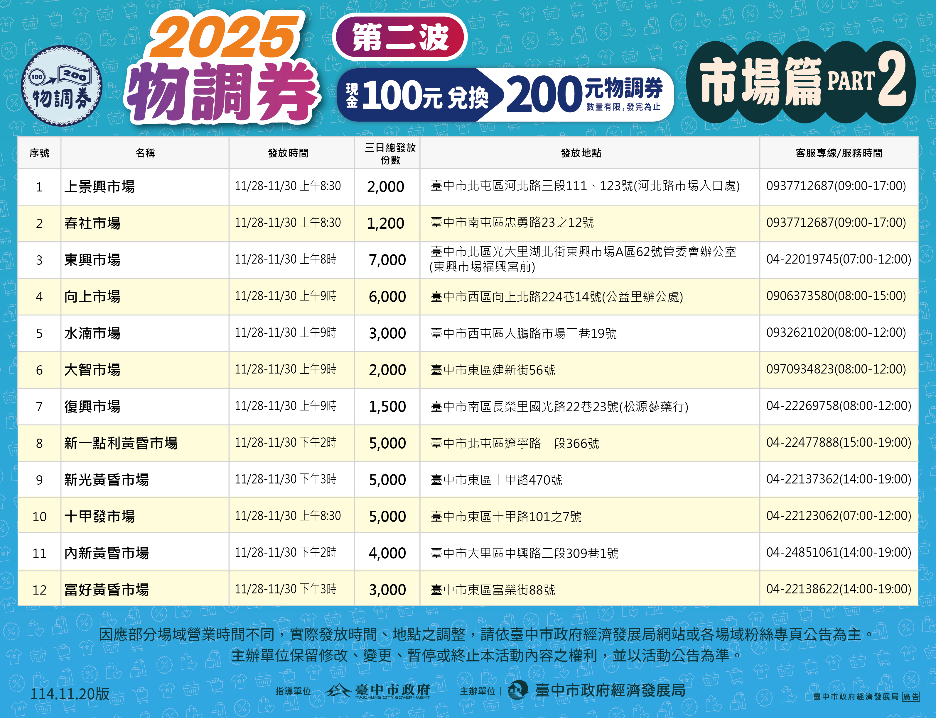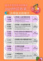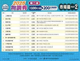 5、因應各場域營業時間不同,發放時間亦不盡相同,詳細資訊應以臺中市政府經濟發展局公告或各場域粉絲專頁發佈為準。
