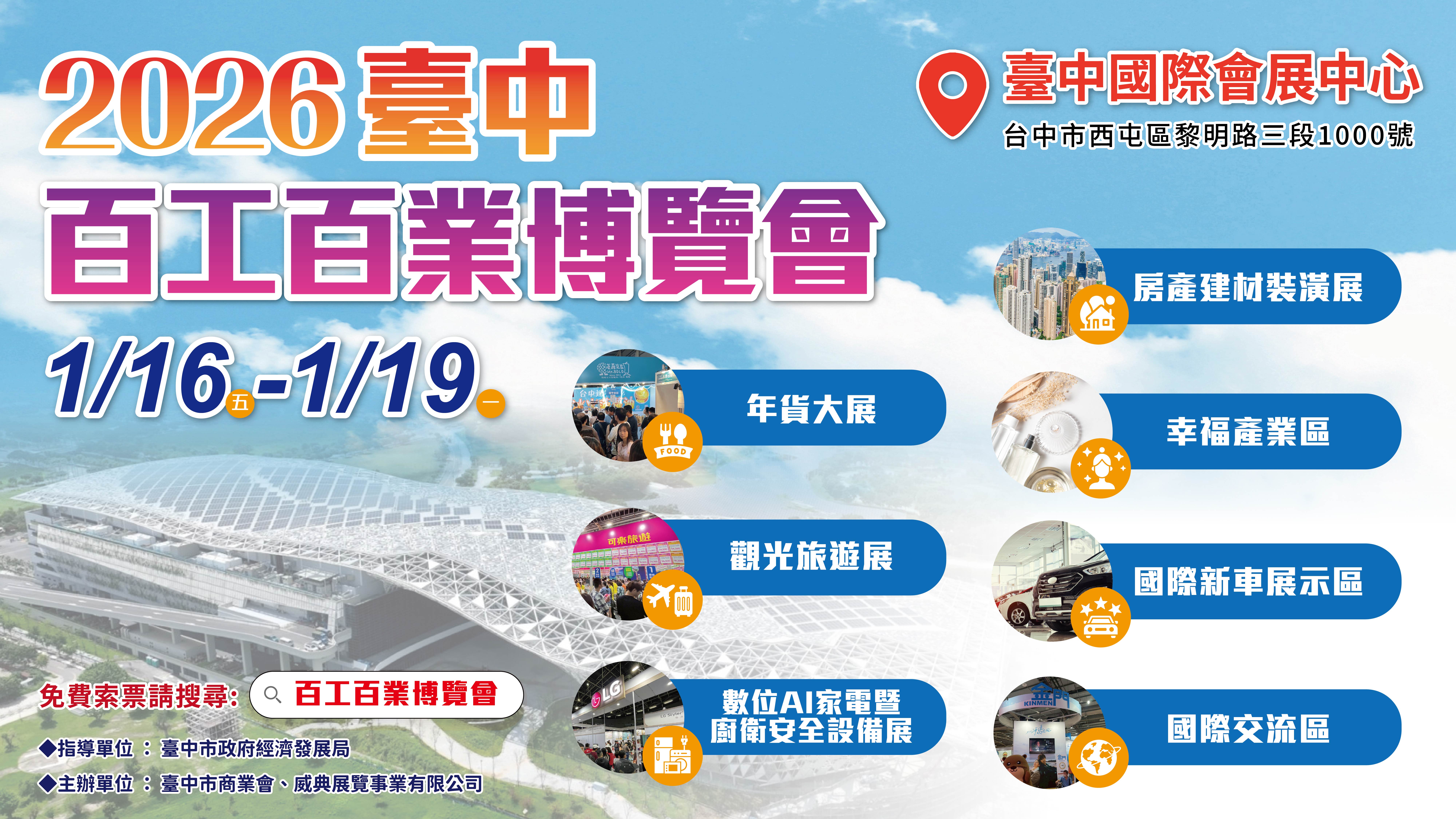 2026臺中百工百業博覽會2026/1/16-1/19盛大登場!七大展區匯聚產業能量,就在臺中國際會展中心(台中市西屯區黎明路三段1000號)。