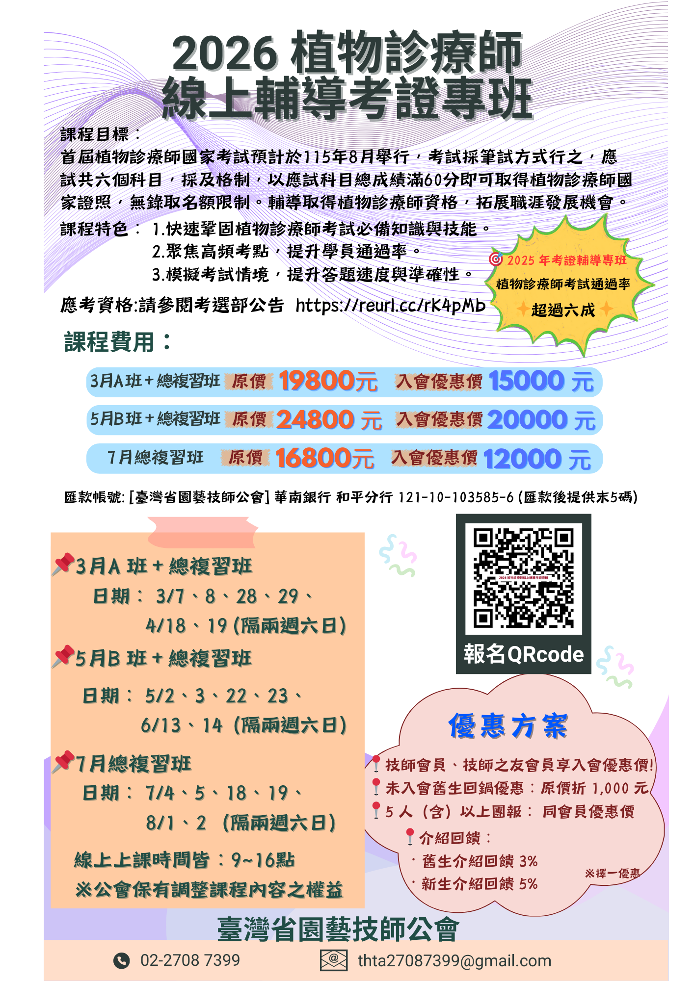 臺灣省園藝技師公會「115年植物診療師線上輔導考證專班」報名宣導單。