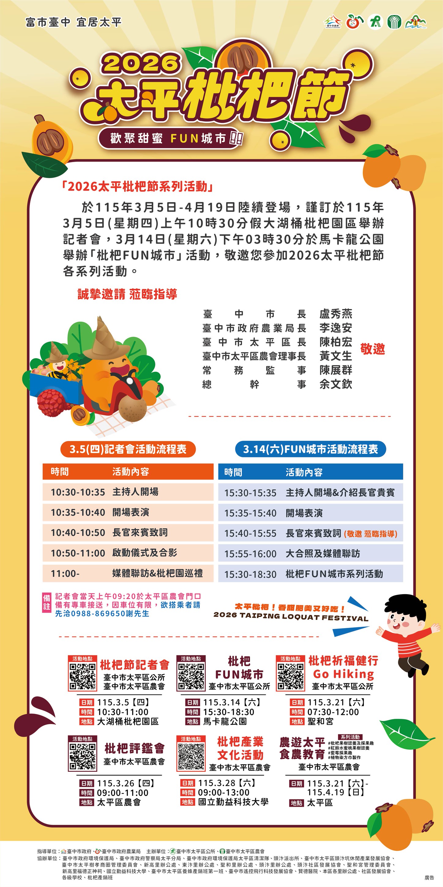 臺中市太平區公所辦理「2026太平枇杷節」系列活動邀請卡、海報及宣傳單如附件,歡迎踴躍參加。