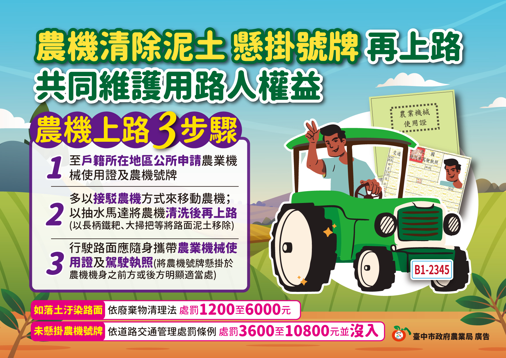 轉知臺中市政府有關「農機清除泥土、懸掛號牌再上路,共同維護用路人權益」宣導單。