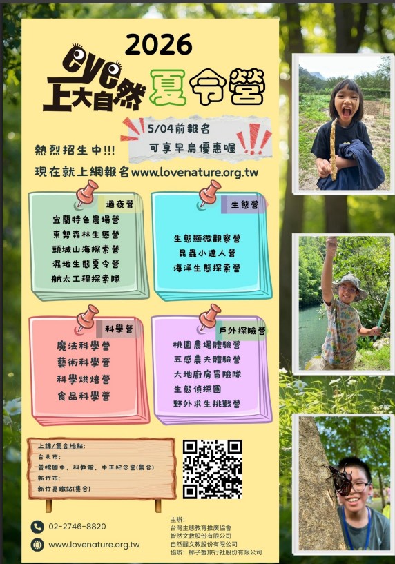 轉知:台灣生態教育推廣協會將舉辦「eye上大自然~2026暑假兒童生態夏令營」活動,歡迎參加