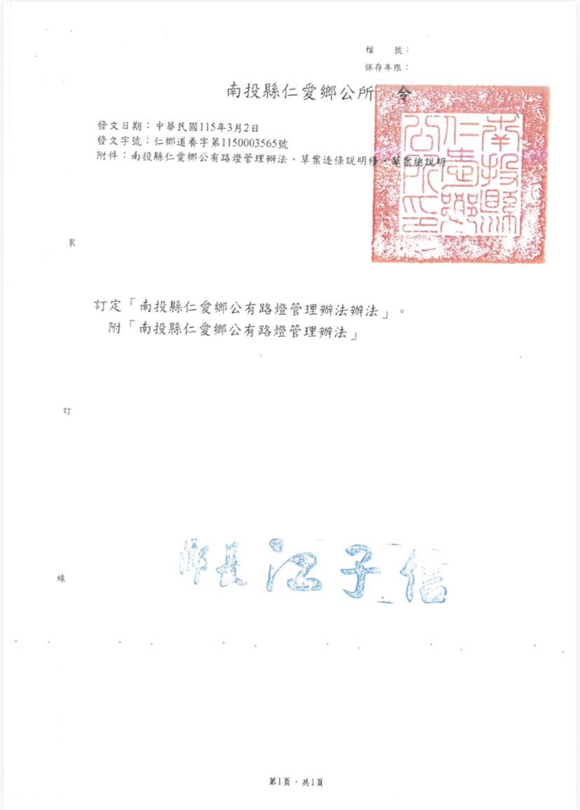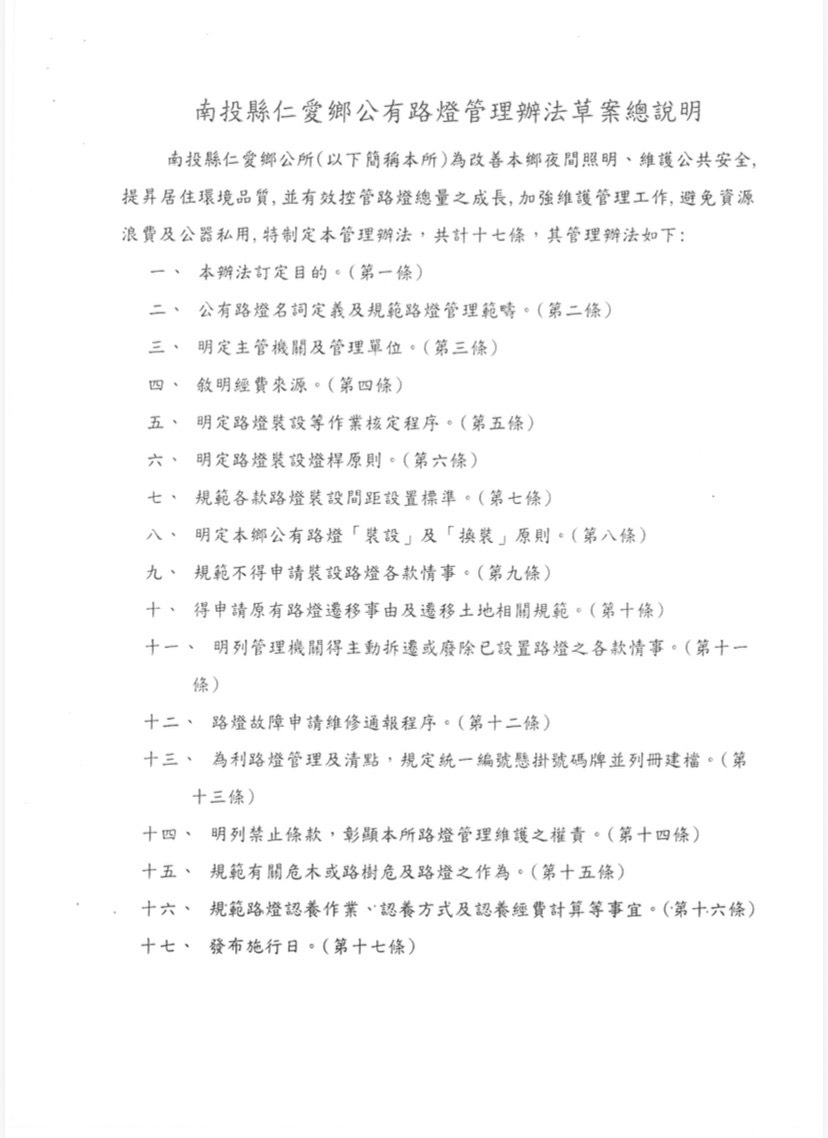 公告南投縣仁愛鄉公所訂定「南投縣仁愛鄉公有路燈管理辦法」之公告、令、辦法總說明及條文各1份
