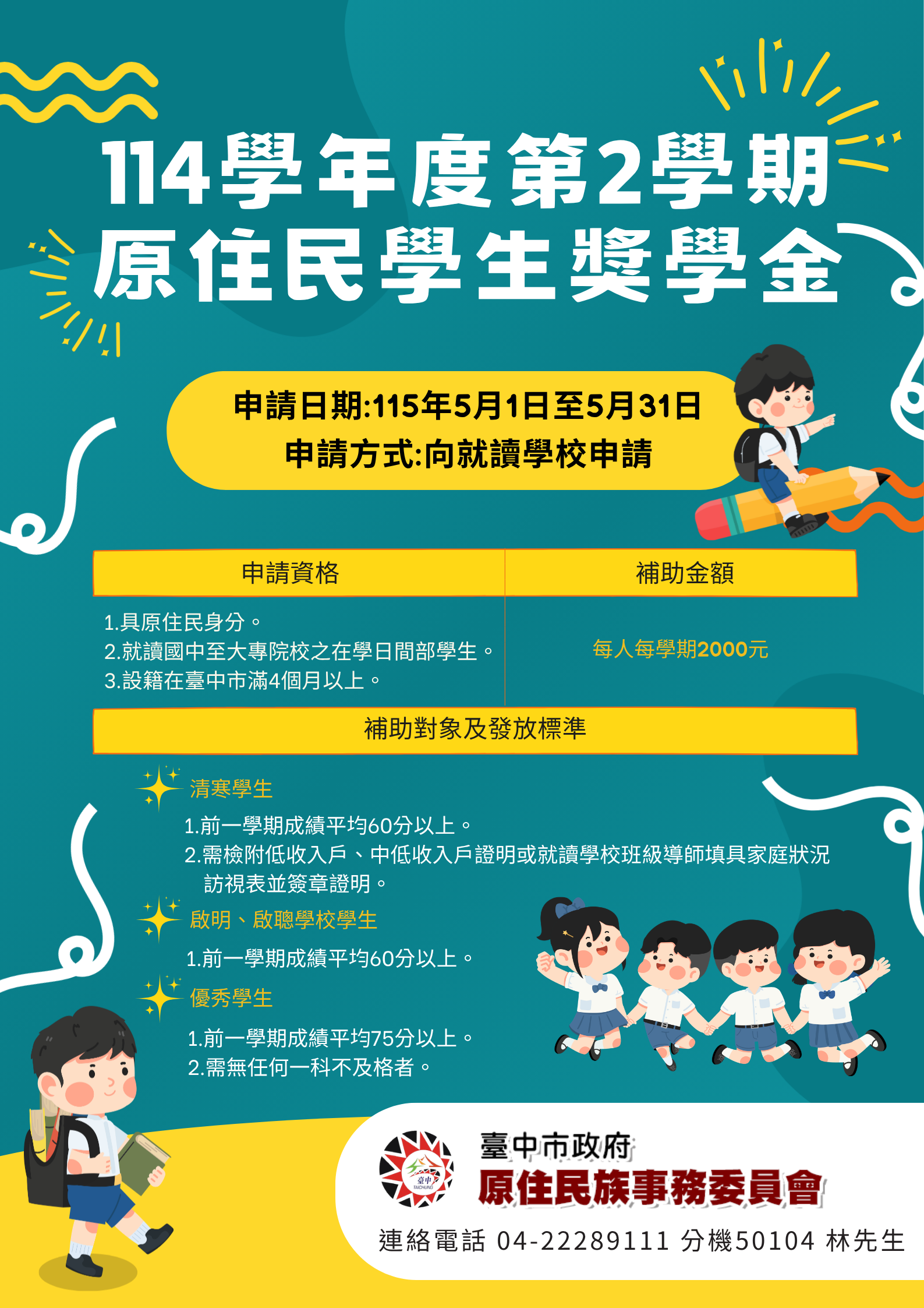 壹、 臺中市政府原住民族事務委員會辦理原住民學生獎學金,於115年5月1日起至115年5月31日止於各學校受理申請