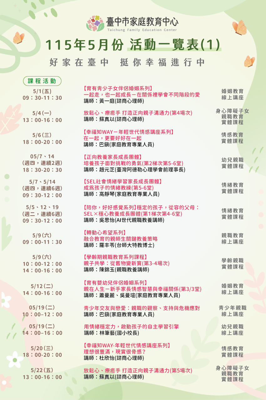 臺中市家庭教育中心5月份活動一覽表,詳請請洽活動海報。
