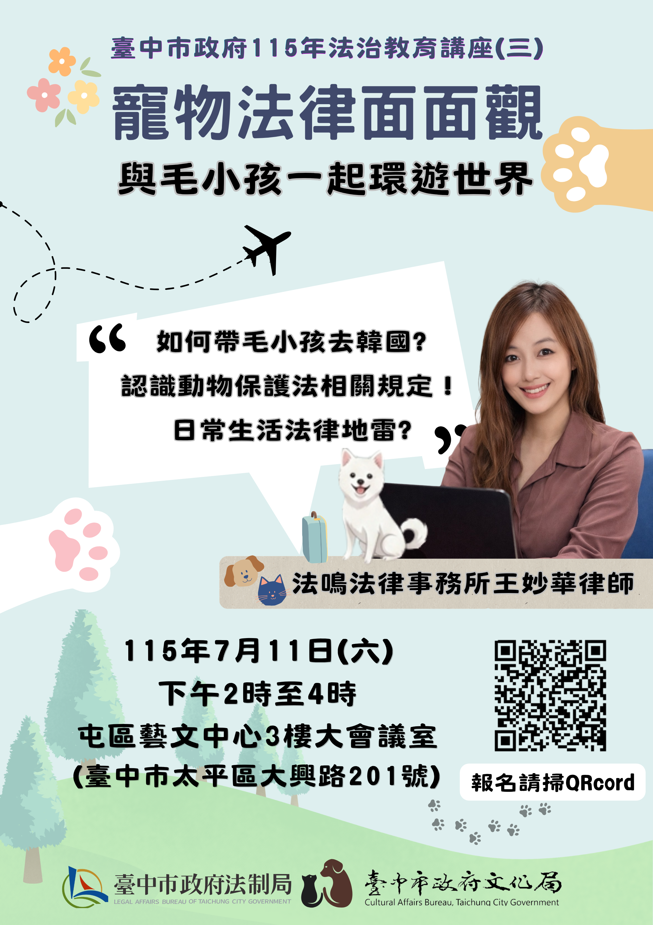 | 一、 | 滿心期待想帶家中的毛小孩看世界,卻不知道要從哪裡開始著手或有什麼規定,日常生活中帶毛小孩出門也有許多需要注意的事,為協助市民了解寵物法律相關問題,臺中市政府法制局局與文化局合辦旨揭課程。 |